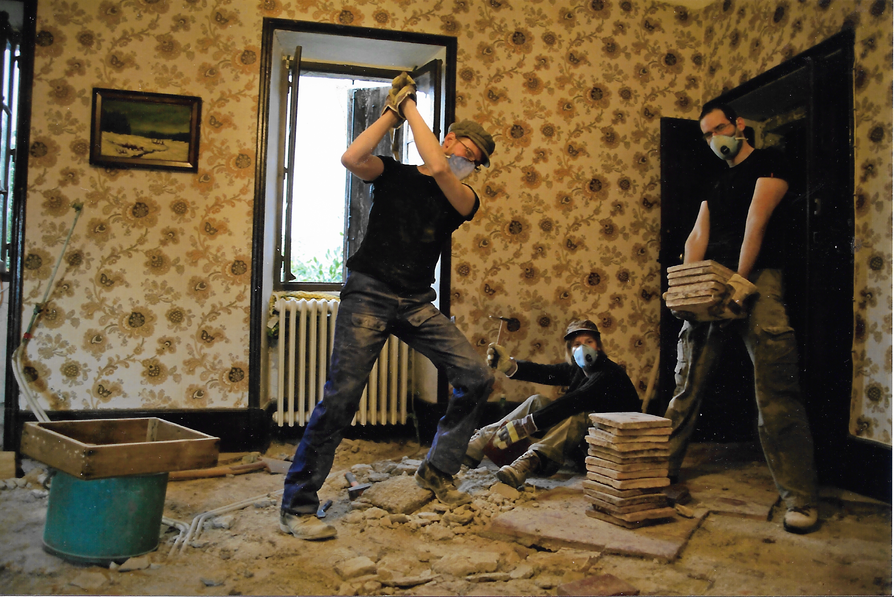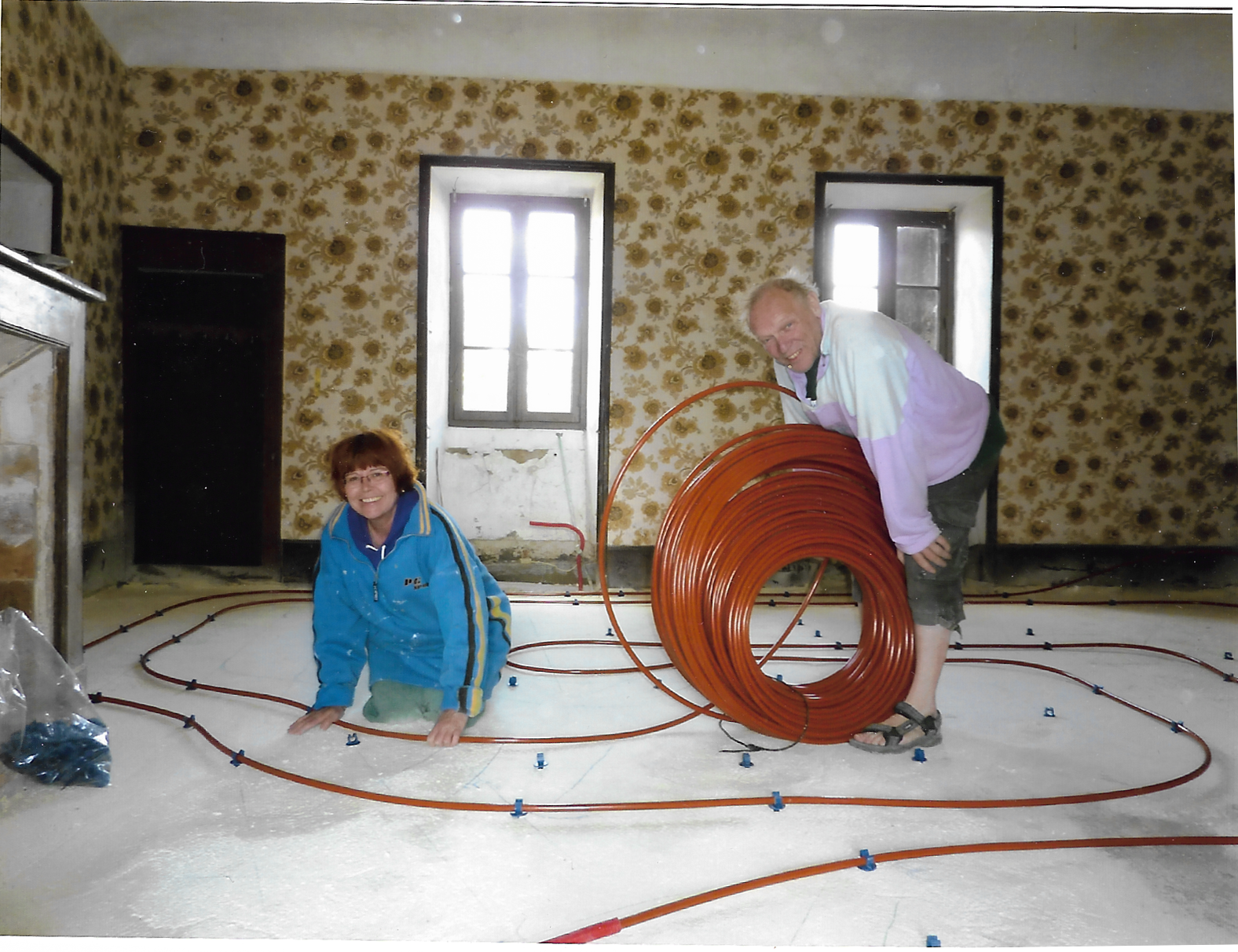 Restait alors une masse de finitions! Ce fût alors un période avec notre ami Jean-Jacques Locher. xxx planché solaire XXX entre autre le carrelage des terrasses, la douche à l'italienne de la salle d'eau ouest, la réfection des voûtes sous la salle à mangé et dans la chambre d'été (6 tonnes de déc routage, idem en ré-enduisage). Suite à cela, les fenêtres apparurent dans un triste état. En deux étapes, elle furent remplacée par Bruno Toulouse, avec des doubles vitrages et, respect des lieux, cadres en chêne. Bruno à aussi réalisé le plan de travail en chêne et marbre de Ruoms pour la cuisine. Pendant 7-8 ans une grosse verrue restait plantée dans la cours. En grillage de chantier barrait l'accès sous la grande terrasse car la voûte y étant peu sécure. Mais comment la consolider. La solution est venue subitement, en deux ans (covid aidant) avec la société TDM spécialiste en projection et façades, qui nous refit cette voûte plus belle que jamais. D'où cette espace c'est transformé en salon de lecture d'été. Alors, entre en scène Geoffrey l'artiste du plâtre et du carrelage. Il terminât le travail par une chape et un carrelage réalisé avec les tommettes récupérées du séjour lors de l'installation des planchers solaires. L'aire Geoffrey est en cours. Taille, déc routage, restauration des plâtre du grand escalier et la salle à mangé. Une longue polémique à propos de la tapisserie de cette grande salle à duré presque 20 ans. A l'entrée, mes femmes, Hélène et Julie, me soutenaient qu'elle était atroce. Moi je soutenait que ce chantier avait la priorité 1234. Puis fût le temps ou cette tapisserie devint vintage. J'avais la paix, mais plus de resserve pour des réfactions notamment suite à des dégât d'eau provoqué par une violente tornade d'août. Nous en étions à l'heure de la priorité 1234. Le petit lutin Cédric se mit au dé-tapissage, Geoffrey à la restauration des surfaces, puis re-Cédric à la peinture. Entre en scène Anne Gérard, vielle copine d'Hélène. Anne était monitrice de ski en valais. Surprenant pour une belge. Mais aussi artiste peintre travaillant directement sur les murs. Il s'en suivi l’apparition de bête préhistorique sur les murs de la "grotte"(sale d'eau) sous les escaliers. Puis une grande fresque du pond d'Arc dans le grand escalier. La suite reste à écrire ... notamment pour la suite des projets solaires, car s'il y a planché solaire, il faut qu'il y ai du solaire thermique et du solaire photovoltaïque.