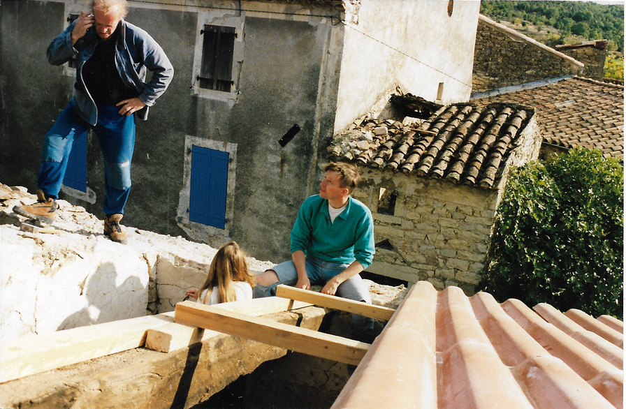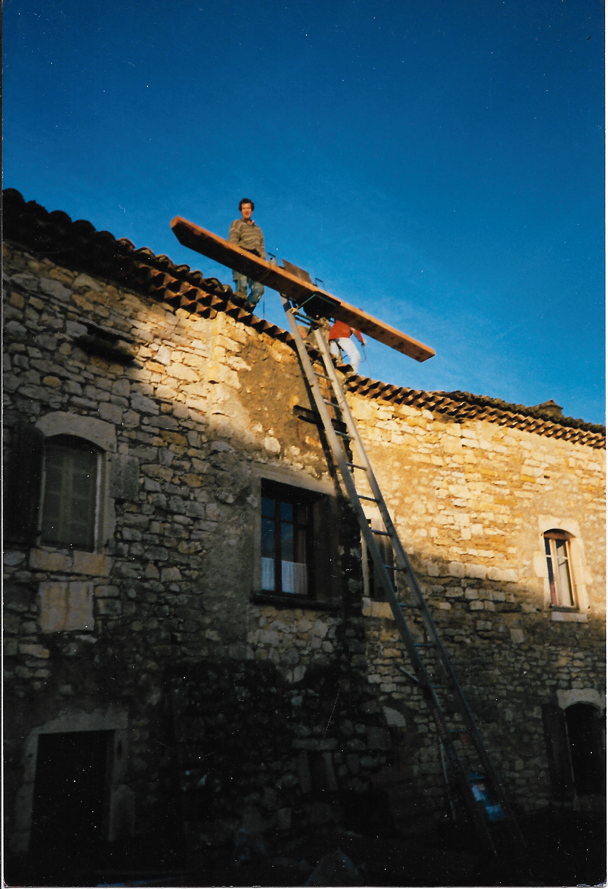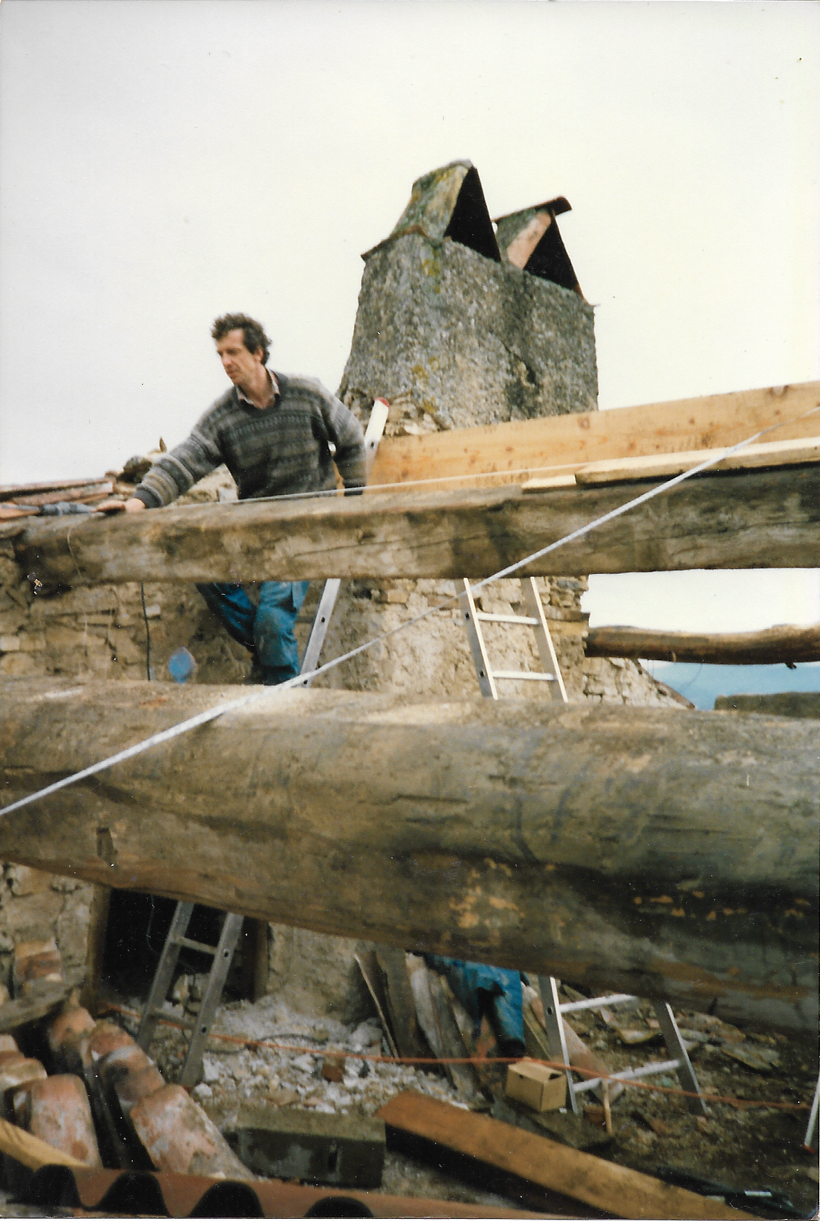 Hélène et moi avons acheté la battisse en 1997 à mon ami Marcel. Il ne pouvait plus l'entretenir. Et, il y avait de coin faire. D'abord, il fallait refaire les 330 m2 de toiture. Nous avons opté pour "l'onduline". Il s'agit tôles ondulées sans amiante et ayant la même longueur d'onde que la tuile romane traditionnelle. Cette solution est bien plus étanche que la tuile romane. C'est moins lourd aussi. Nous avons fait ce chantier en trois campagnes avec l'aide précieuse de mon ami de grimpe Pierre Vilanis et un multitudes d'ami que sont venus nous aider. Des chantiers dures mais festifs !