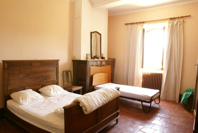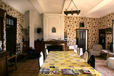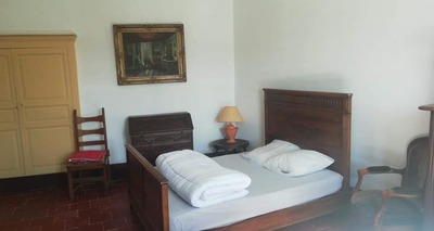 Il est normal que vous désiriez voir un peu plus de nos intérieurs. Même si vous venez dans le sud en comptant fermement sur le fait que le soleil sera de la partie presque tout le temps et que par conséquent vous vivrez essentiellement à l'extérieur, vous voulez voir à quoi ressemble les chambres. Sont-elles propres, spacieuses. Quel est le style du mobilier ? Nous vous présentons ici un tout petit aperçu des chambres et autres espaces intérieurs. Les chambres sont elles spacieuses ? La réponse est plutôt franchement Oui, vu qu'elles sont prévues pour deux ou trois personnes et que la plus petite fait 12 m². Quant au mobilier, nous pouvons affirmer qu'il est plutôt en accord avec l'époque de la maison. Même si cette question d'époque est peu peu précise pour deux bonnes explications, il nous est apparu clairement que l'"ikea" n'avait pas sa place en ces lieux. Le mobilier est donc ancien, beaucoup en noyer et merisier. Les portes du séjour aussi. Petite digression sur l’époque. Celle-ci est floue parce qu'il est clair que l'édifice n'a pas été réalisé en une fois. Les charpentes des toitures indiquent que le toit du gîte est bien plus ancien que celui du séjour. A contrario, les ferrures de porte du séjour sont du 18ème voir même plus anciennes dans la cuisine d'été. Bon, elles ont peut être été récupérées dans une battisse aristocratique détruite. Allez savoir ? Au départ, le mas ne devait pas avoir de prétention bourgeoise. Ceci explique sûrement le fait que nous n'ayons trouvé aucune pierre gravée d'une date. Mais au fait que prouverait une telle date ? Peut être que cette pierre appartenait au château d’où elle provient et qui était marquée de cette date. Bref, il reste du mystère.